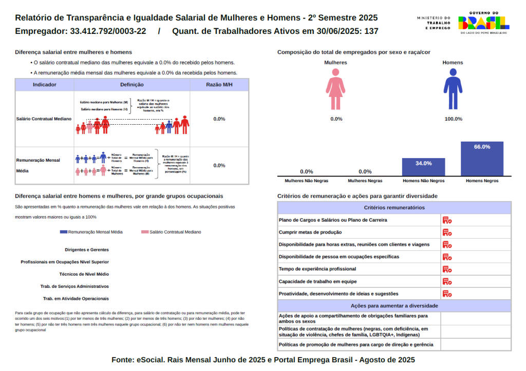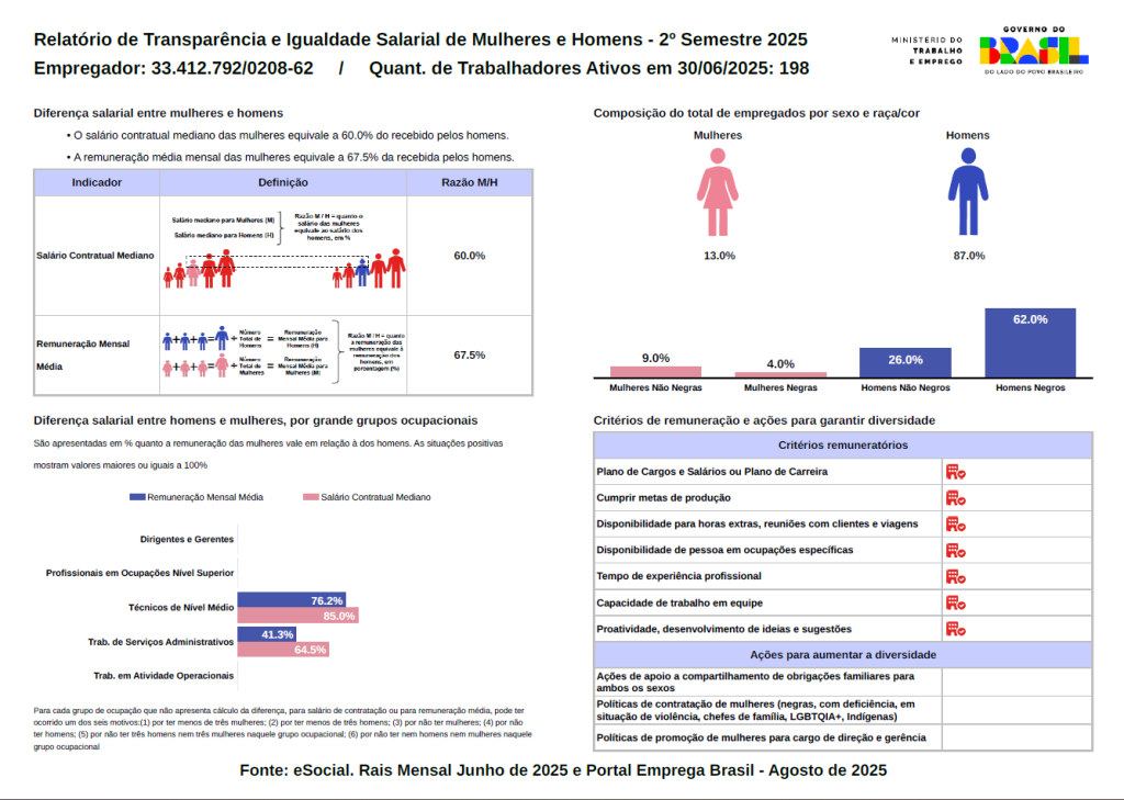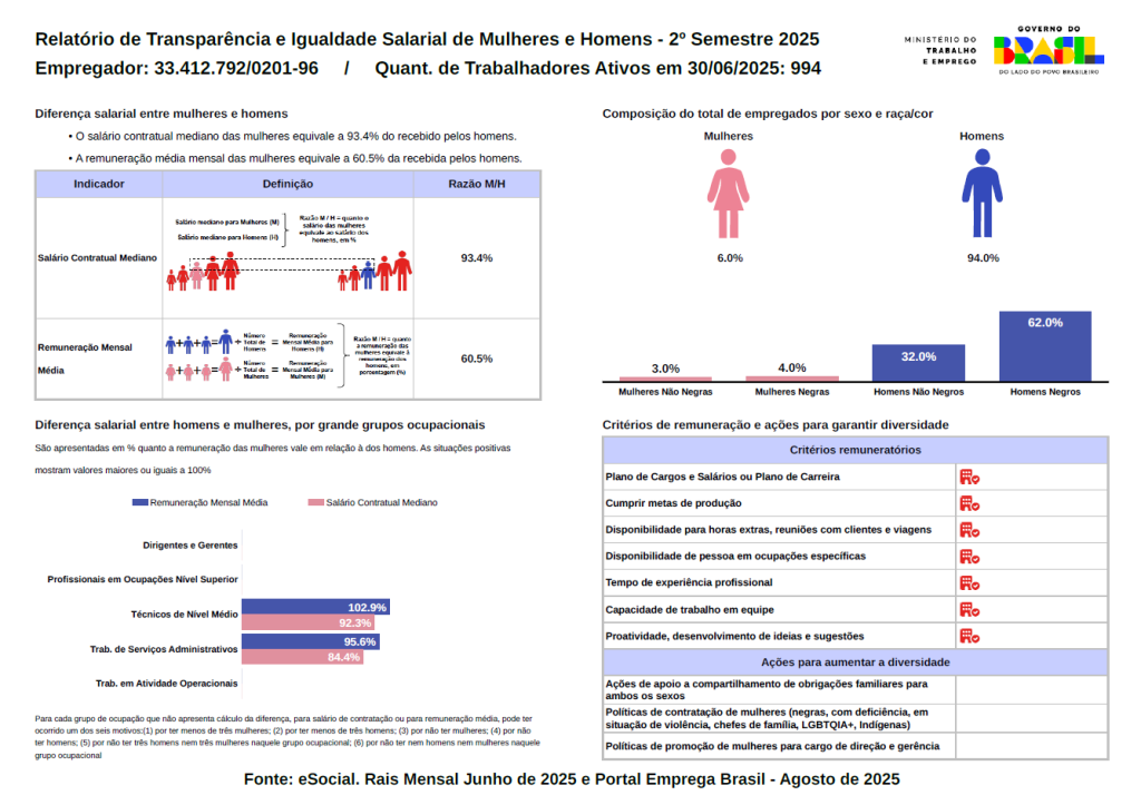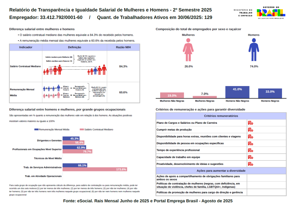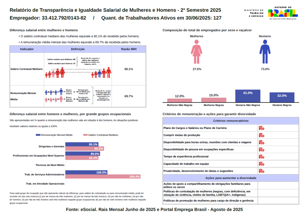 Conforme previsto na lei 14.611/2023, publicamos os Relatórios de Transparência e Igualdade Salarial de Mulheres e Homens, divulgados pelo Ministério do Trabalho e Emprego, referentes aos estabelecimentos que possuíam 100 (cem) ou mais empregados ativos em 31/12/2022, listados abaixo: